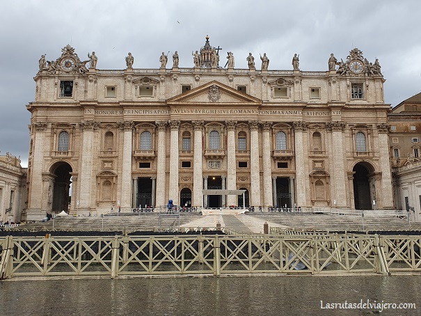 La basílica de San Pedro empezó a construirse en 1506, bajo la dirección de Bramante. Las obras duraron nada más y nada menos que casi siglo y medio, siendo Urbano VIII quien la abrió al culto el 18 de noviembre de 1626. Su fachada es magistral, con proporciones verdaderamente grandiosas, empleando el orden corintio gigante, con un imponente pórtico central y dos arcadas en los lados. Está coronada por un ático abalaustrado que sostiene trece enormes estatuas que representan a Cristo, a San Juan Bautista y a todos los Apóstoles, a excepción del Santo que le da el nombre.