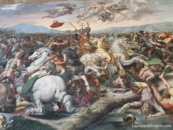 Estancia de Constantino: Los frescos de esta sala, comenzados en 1517, son obra principalmente de los discípulos de Rafael e ilustran el triunfo de la fe cristiana sobre el paganismo a partir de momentos clave en la vida del emperador Constantino.