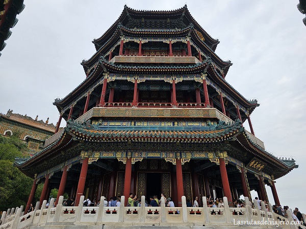 Porque efectivamente, en lo más alto de la Colina de la Longevidad se alza imponente la Pagoda del Incienso Budista, donde llegaría casi sin aire. Esta es una de las estructuras más emblemáticas del Palacio de Verano, con sus 41 metros elevándose en la ladera de la colina y dominando unas prodigiosas vistas sobre el lago Kunming.